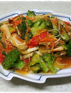 오늘의 요리는 부추가 없는 부추 버섯 잡채입니다. 부추가 없는데 어떻게 부추 잡채냐구요? ^_^ 뭘로 부추를 대신할까요?재료입니다. 새송이 버섯 1개, 표고버섯 3개, 팽이버섯 1봉지, 양파 1/2개, 색깔별 파프리카 각 1/2개씩 (여러색깔이 없으시면 총량을 비슷하게 하시면 됩니다. 적당한 크기 기준으로 1.5개~2개정도 분량), 당근 1/4개, 브로콜리 100g (한송이의 꽃부분 모두 정도) 청양고추 1개, 쌈케일 100g (대략 20장 정도) 향신장 1큰술, 천일염 약간, 녹말물 약간, 참기름 약간, 후추 약간, 통깨 약간, 채소우린물(또는 그냥 물) 1/2컵 재료는 브로콜리와 팽이 버섯을 제외한 모든 재료를 채썰어줍니다. 버섯의 경우는 너무 가늘게 채썰필요는 없구요. 당근처럼 잘 안익는 재료는 가..
