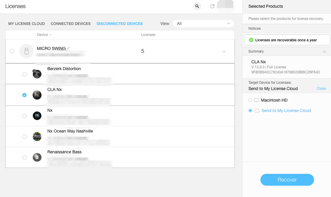 위 그림처럼 이동을 원하는 제품을 선택하면, Licenses are recoverable once a year 라는 알림이 나오고